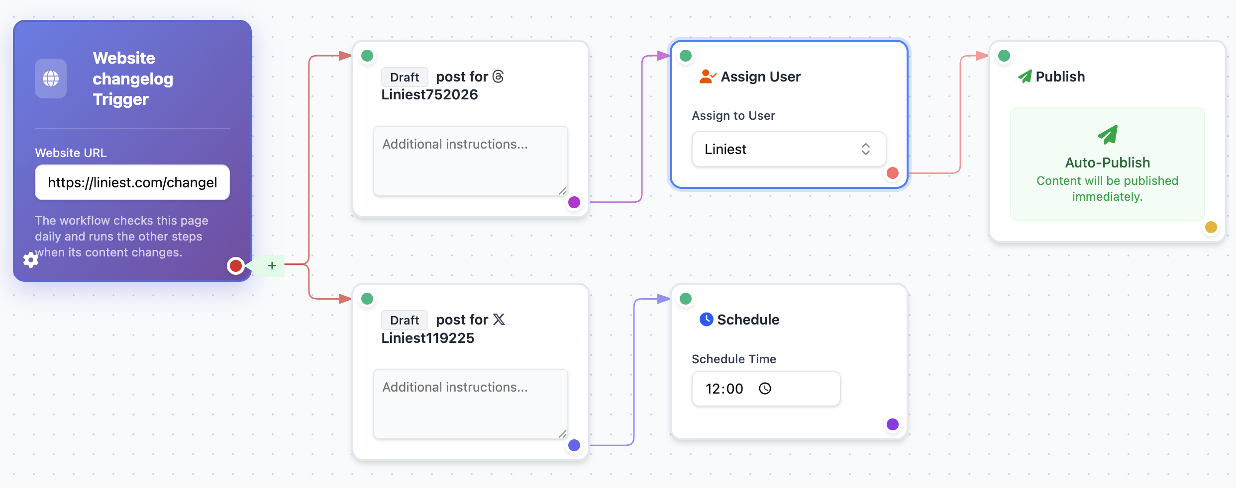 Build repeatable flows for recurring work like changelogs, auto-drafting, and scheduling, while keeping manual posting available.